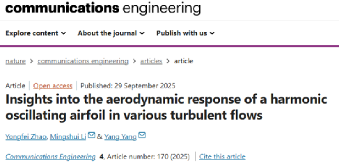 2025年9月29日,《Nature》旗下首个工程领域子刊《Communications Engineering》在线发表了437必赢会员中心风工程团队的最新研究成果《Insights into the aerodynamic response of a harmonic oscillating airfoil in various turbulent flows》,博士生赵勇飞为第一作者,李明水教授和杨阳老师为共同通讯作者。该研究,系统性地揭示了湍流对振荡翼型非定常气动特性的影响机理,为风能、低空经济和大跨度桥梁设计等工程领域提供了理论基础。
