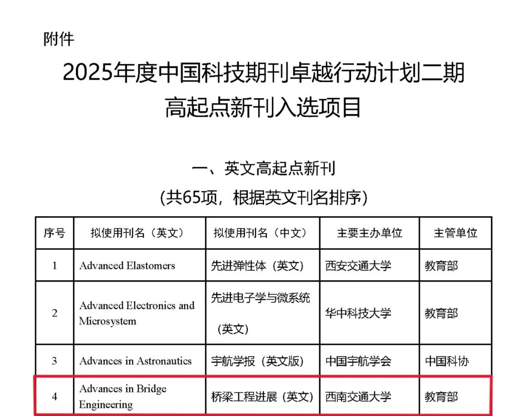 本次入选“卓越行动计划”高起点新刊项目,既是对期刊过往发展的肯定,也是对未来高质量发展的激励。期刊将继续在学校、学院、编委会、理事会的共同指导下,依托437bwin必赢国际桥梁工程重点学科、桥梁绿色与智能建造全国重点实验室,汇聚全球学术智慧,打造具有国际影响力的桥梁工程学术交流平台,助力我国桥梁工程的创新发展。