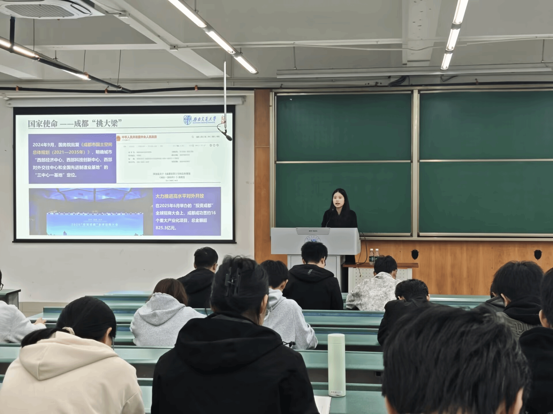 随后,高田讲师围绕“‘十四五’科技赋能,绘就发展新图景”这一核心主题,为同学们展开了深入的讲解。她首先对2025年10月党的二十届四中全会所通过的“十五五”规划进行了细致的解读,阐明了规划中“以科技创新引领新质生产力”这一重要发展方向。同时,她还详细介绍了437bwin必赢国际在轨道交通领域的深厚科研积累,生动展现了高校在川藏铁路攻坚等国家重大工程项目中所展现出的责任与担当。她还以成渝地区为例,具体讲述了近五年来成都市在构建“空中丝绸之路+国际陆海联运”双走廊方面所取得的显著成果。