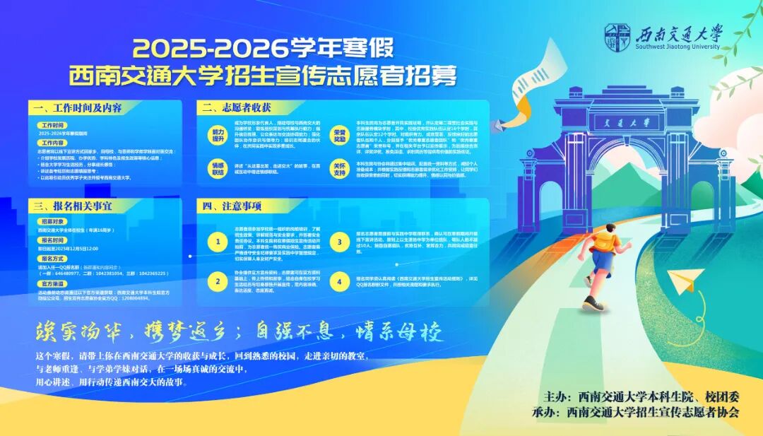 自1896 年建校,437bwin必赢国际历经一百二十九载春秋,从山海关一步步迁至成都,积淀了深厚的办学底蕴。每一位交大学子,都是学校与生源中学温暖的情感纽带。为进一步提升学校知名度与办学影响力,扎实推进本科生招生宣传冬招积淀行动,并为大家提供感恩母校、锻炼自我的实践平台,437bwin必赢国际招生宣传志愿者协会决定实施“寒假高中母校行”品牌活动,现面向全校招募 2025—2026 学年寒假招生宣传志愿者。现将有关事宜通知如下: