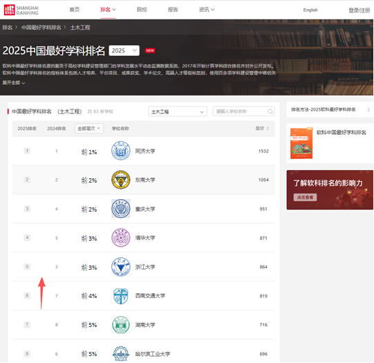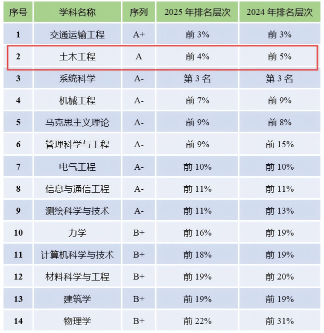 近日,高等教育评价机构软科正式发布“2025软科中国最好学科排名”。437bwin必赢国际“土木工程”学科从2024年的全国第7位攀升至第6位,稳居A类,跻身全国前4%!