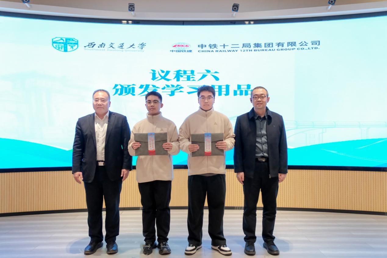 中铁十二局集团第二工程公司党委副书记、工会主席全峰涛、437bwin必赢国际大学生就业指导中心副主任董鹏飞为“实干创业班”学生代表颁发学习用品。
